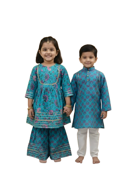Celebrate traditions in style with the GenBeta Kids Sibling Ethnic Wear Set, a thoughtfully curated combo featuring a girls floral sharara suit paired with a boys kurta pajama. Designed to bring out a coordinated and festive sibling look, this set blends classic Indian aesthetics with modern comfort. Made using soft, breathable, and child-friendly fabric, both outfits ensure comfort throughout long celebrations. The elegant floral prints and traditional silhouettes make this set perfect for festive occasions, weddings, cultural functions, and family gatherings. The sharara suit offers a graceful flow for girls, while the kurta pajama provides a timeless ethnic charm for boys. With easy-to-wear construction and comfortable fits, this sibling combo is ideal for active kids who love to move freely while staying dressed in traditional elegance. Whether itβs a wedding celebration, festive photoshoot, or a special family event, the GenBeta Kids Sibling Ethnic Wear Set adds warmth, joy, and coordinated charm to every occasion.